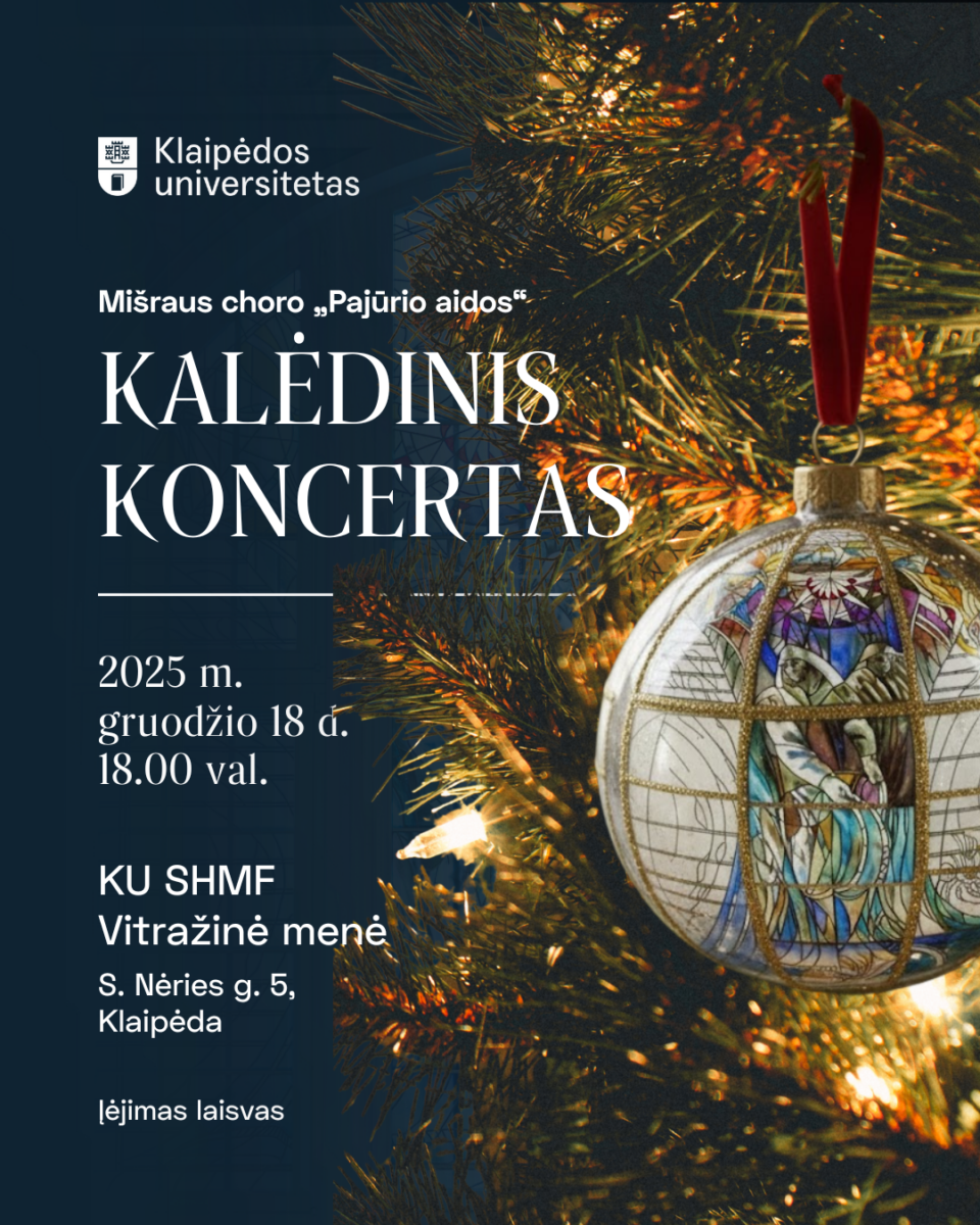 Artėjant didžiosioms metų šventėms, Klaipėdos universiteto mišrus choras „Pajūrio aidos“ kviečia miesto bendruomenę ir svečius trumpam sustoti kasdienybės šurmulyje, pabūti kartu ir pasimėgauti gyva muzika. 2025 m. gruodžio 18 d. 18.00 val. atnaujintoje Klaipėdos universiteto Socialinių ir humanitarinių mokslų fakulteto Vitražinėje menėje (S. Nėries g. 5, Klaipėda) vyks nemokamas koncertas.