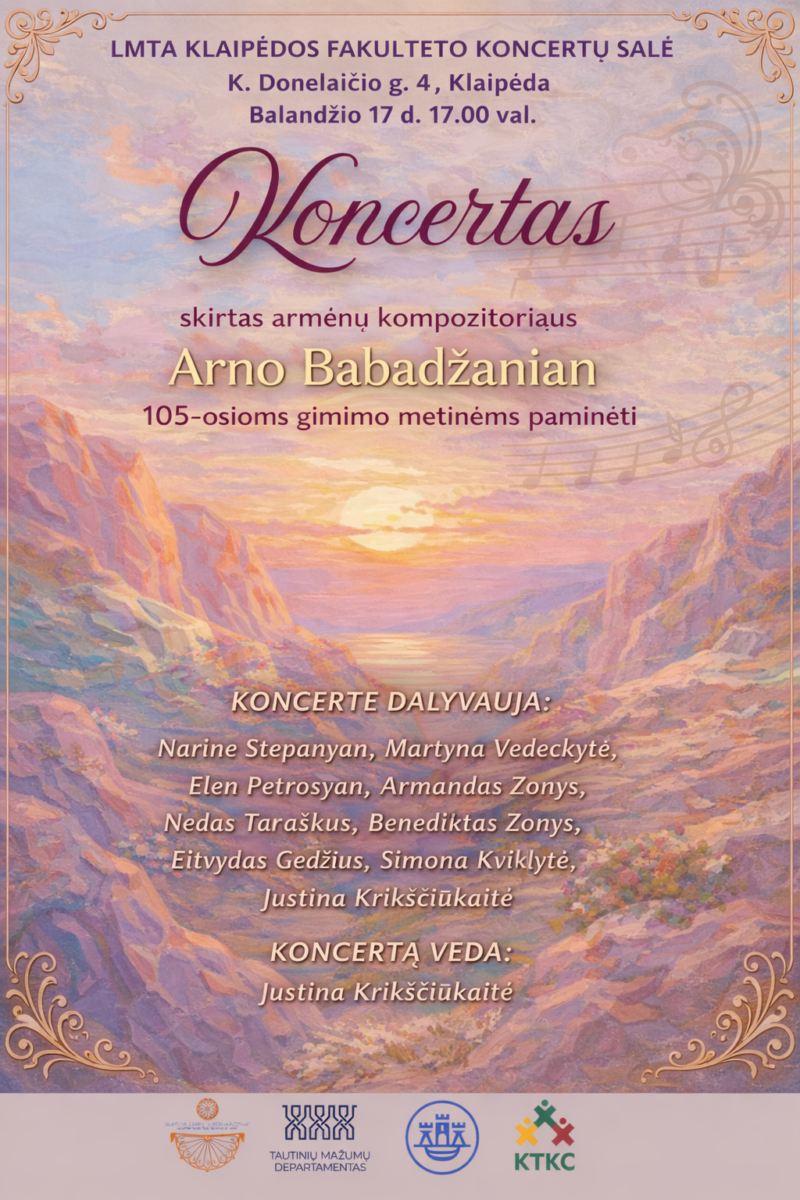 Koncertas vyks balandžio 17 d. 17 val. LMTA Klaipėdos fakulteto koncertų salė, K. Donelaičio 4)